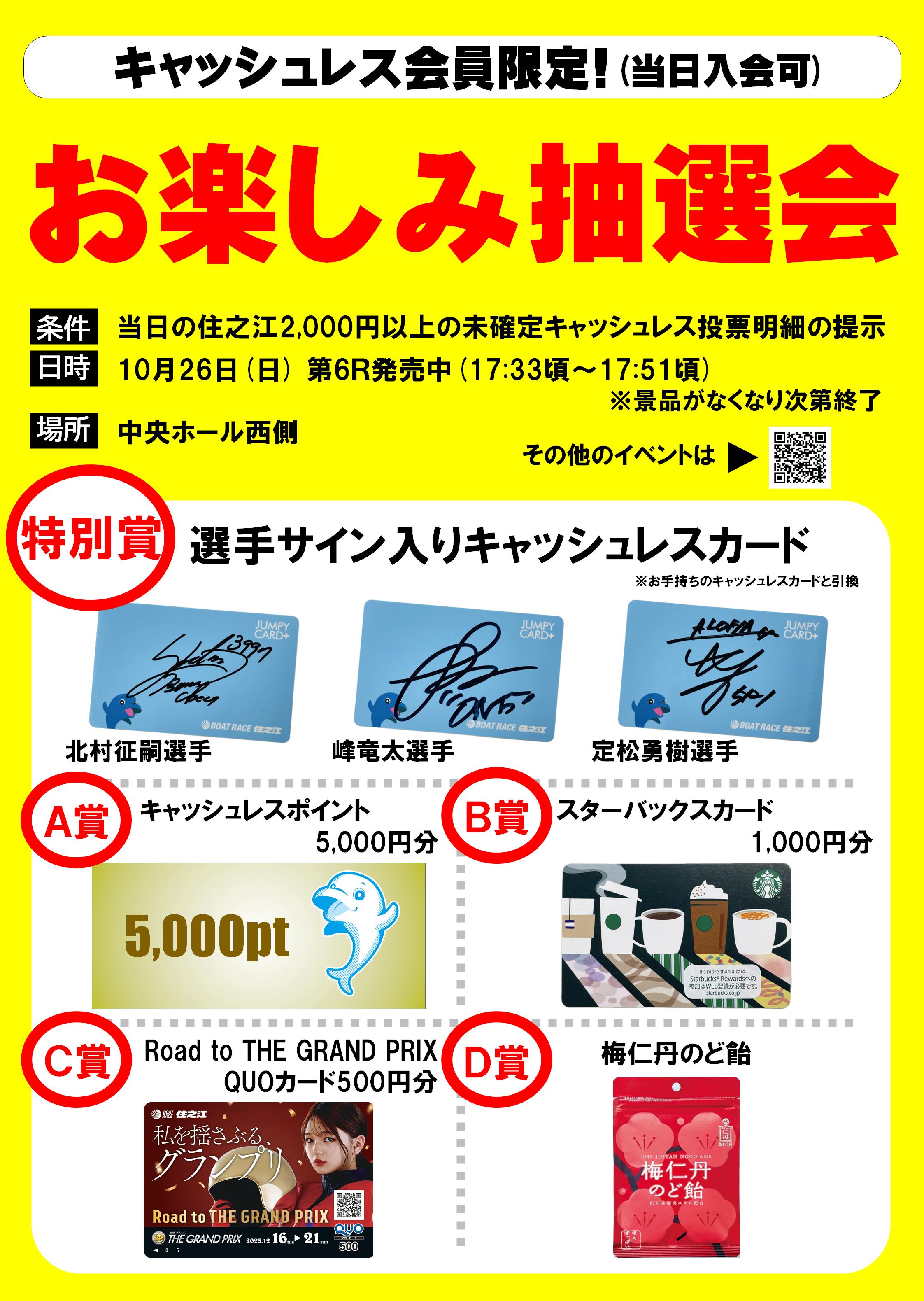 当日のボートレース住之江の未確定舟券又は未確定キャッシュレス投票明細1,000円分をご提示いただくと、出場選手サイン入りICカードケースが当たる抽選会に1回ご参加いただけます。