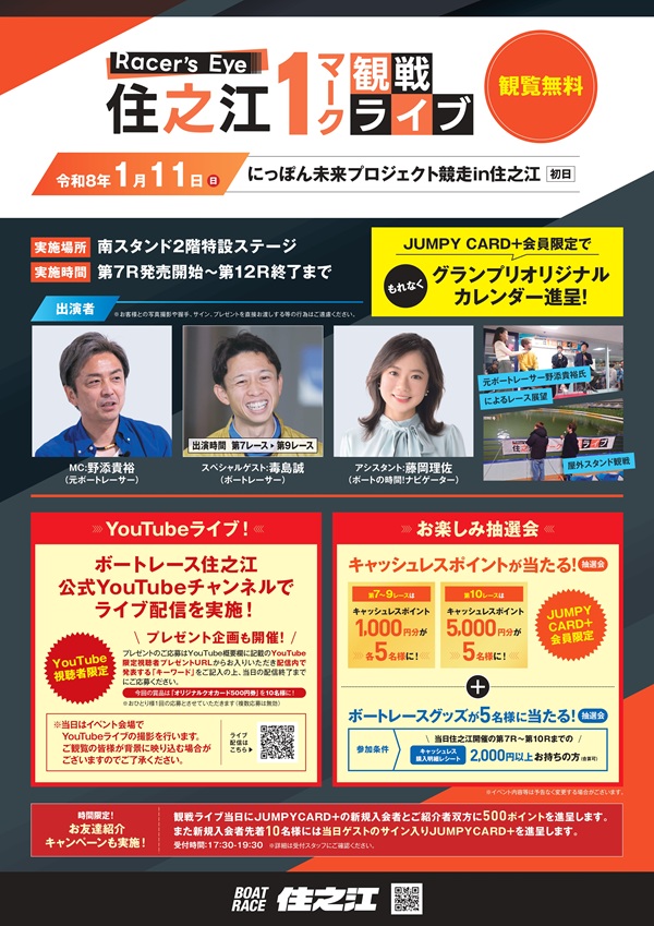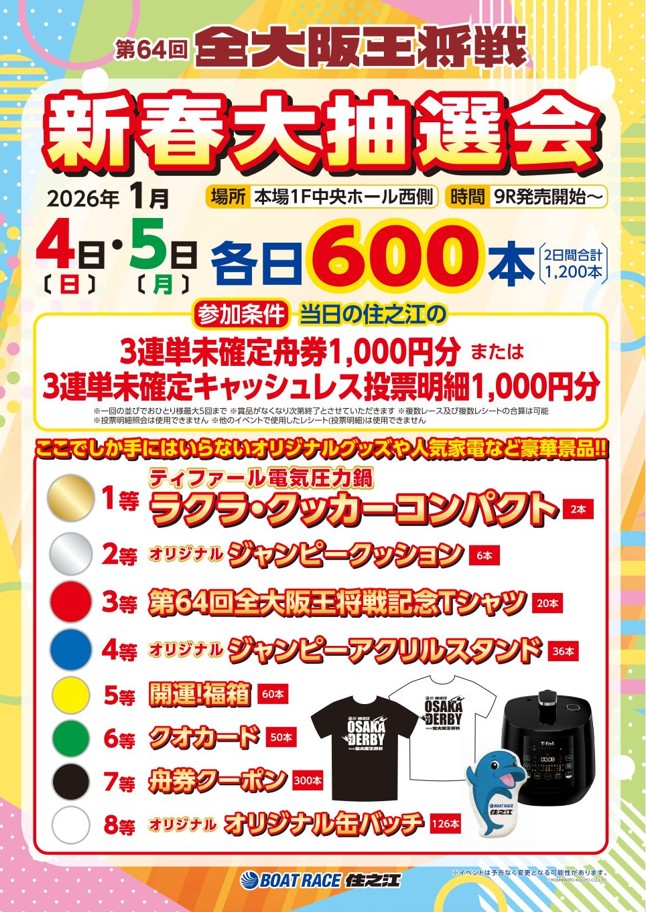 当日の住之江の3連単未確定舟券または未確定キャッシュレス投票明細1,000円分につき1回抽選会にご参加いただけます。