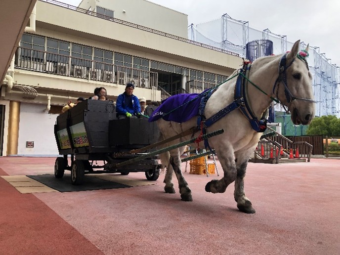 ハクウンリューが曳く馬車に乗って芝生広場をゆっくり周遊できる特別体験。