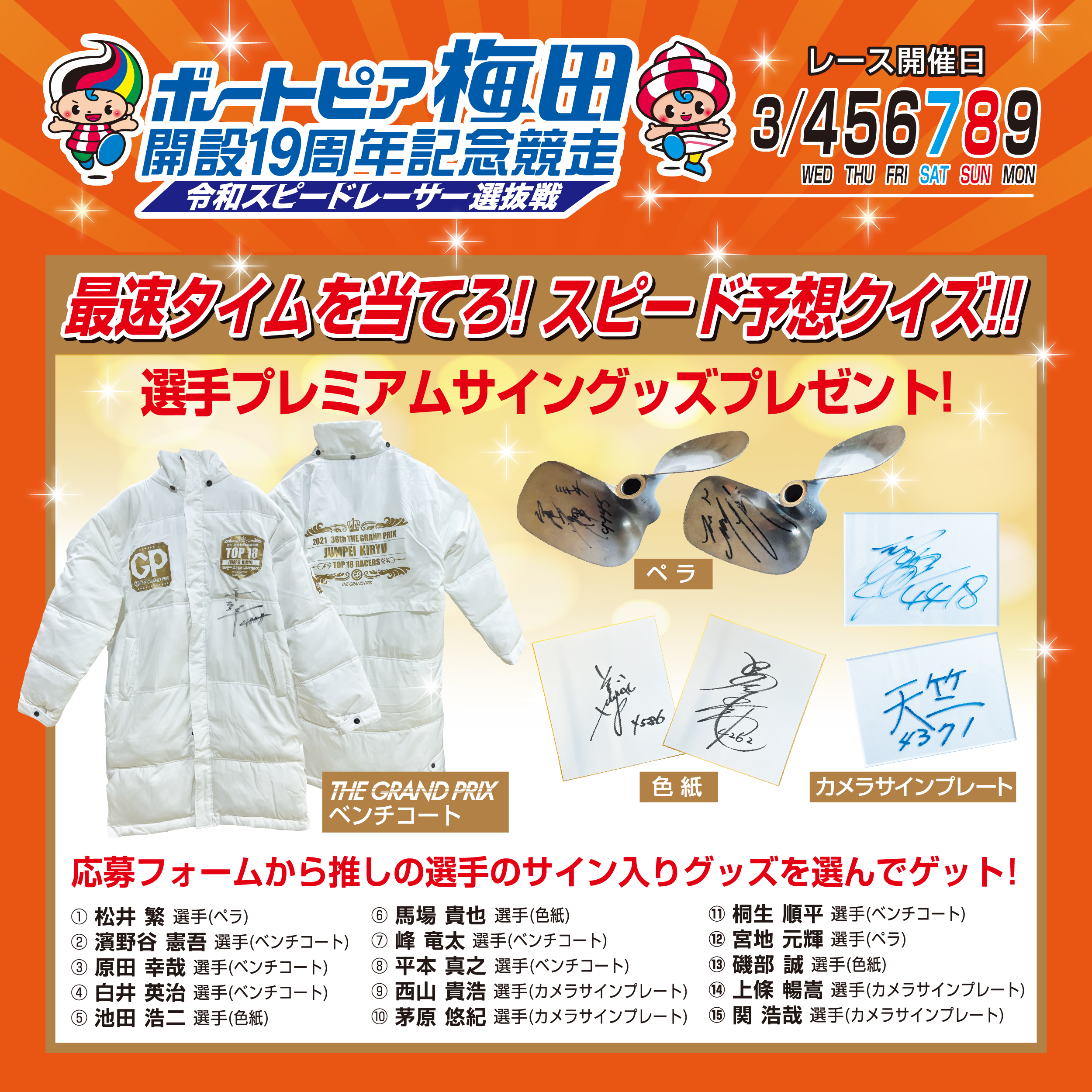 3/4(水)~3/9(月)に開催する「ボートピア梅田開設19周年記念競走〈令和スピードレーサー選抜戦〉」を記念し、選手プレミアムサイン入りグッズが当たる、「最速タイムを当てろ!スピード予想クイズ!!」を実施いたします!