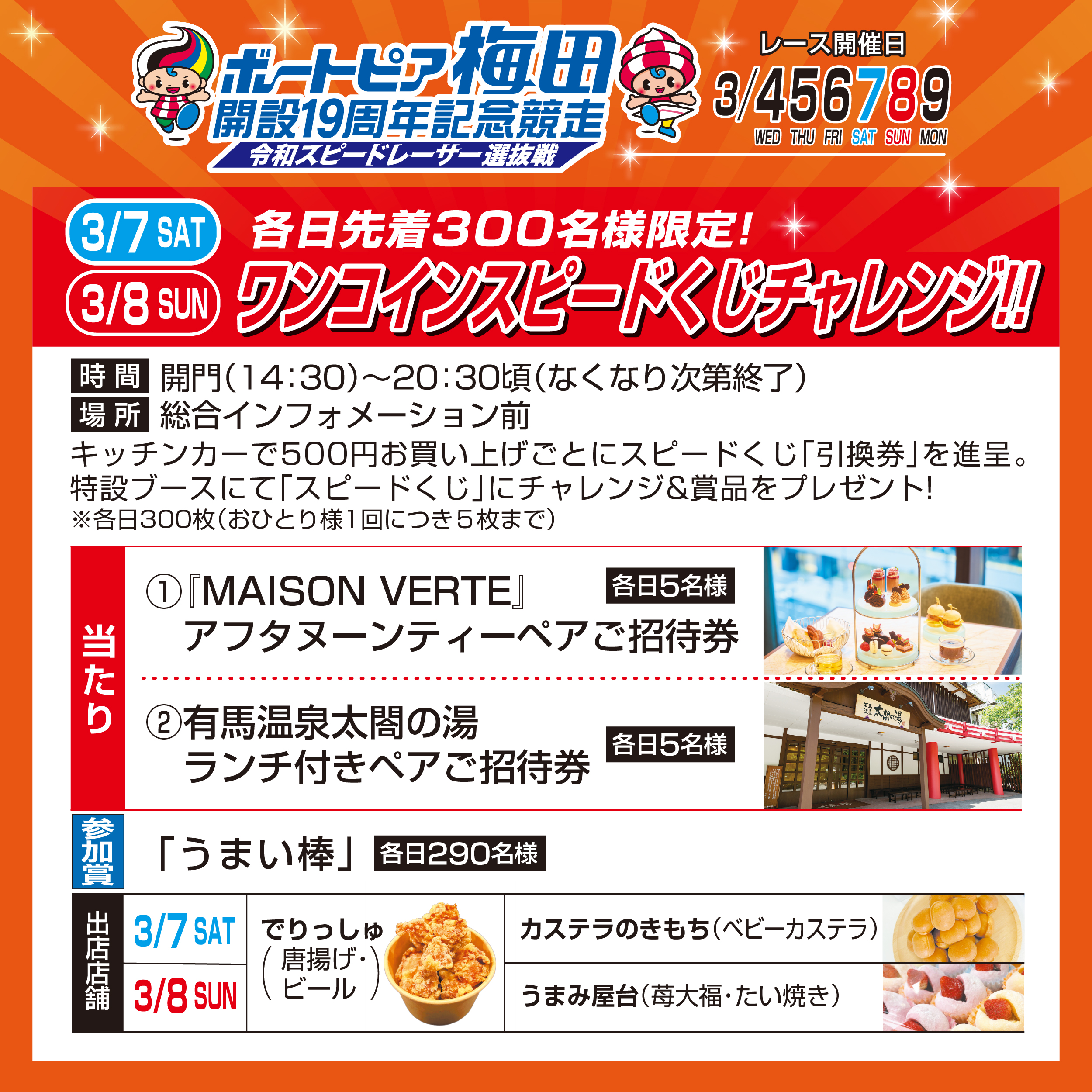 3/4(水)~3/9(月)に開催する「ボートピア梅田開設19周年記念競走〈令和スピードレーサー選抜戦〉」を記念し、豪華賞品が当たる、「ワンコインスピードくじチャレンジ!!」を実施いたします!