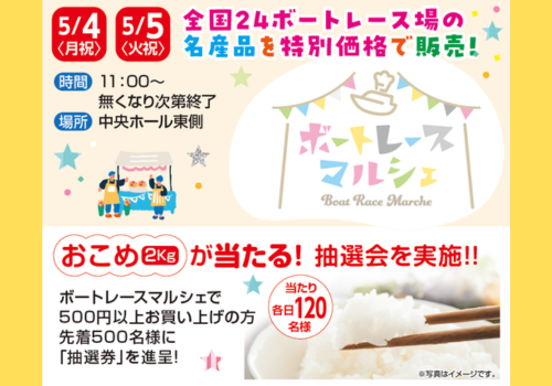 また、ボートレースマルシェにて500円以上お買い上げの方に各日120名様におこめ(2㎏)が当たる抽選会にご参加いただけます!!