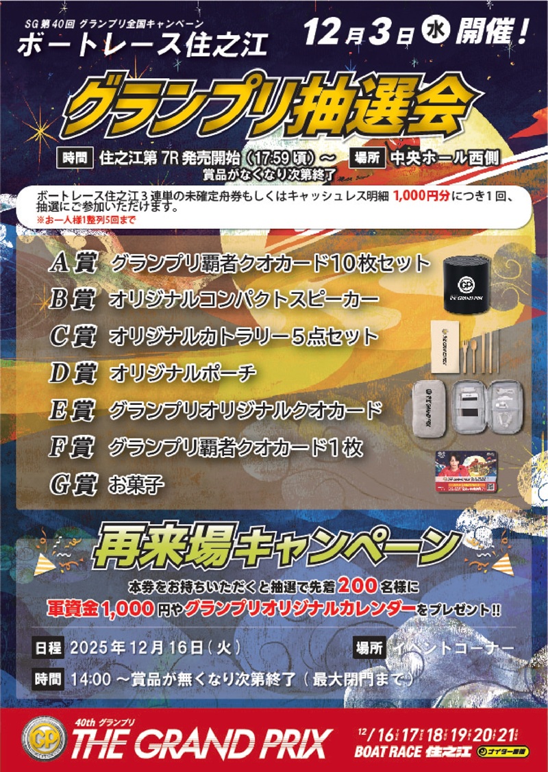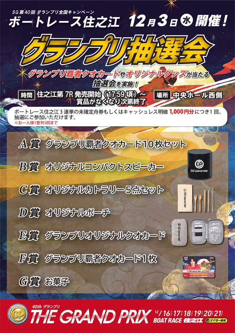 当日の住之江の3連単未確定舟券またはキャッシュレス投票明細1,000円分につき1回ガラポン抽選にご参加いただけます。