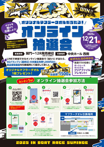 LINEで参加できるオンライン抽選会で「当たり」が出たら、SGグランプリ(最終日)の未確定舟券1,000円分と、景品受取画面を引換場所にて提示して頂くと、オリジナルマフラータオル1枚プレゼント!