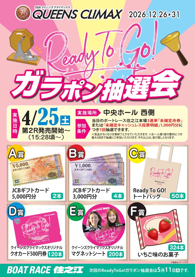 第1回目となる「スポニチ杯争奪第60回なにわ賞」では、JCBギフトカードやReady To Go!オリジナルグッズを中心にプレゼント!当日のボートレース住之江「3連単未確定舟券」または「3連単未確定キャッシュレス投票明細」1,000円分に」つき1回、抽選会にご参加いただけます。