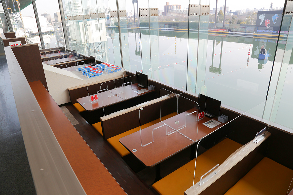 フラットなエリアに8場対応モニターを備えたファーストクラス感覚のシングル席です(水面を見ながらの観戦は出来ません)。